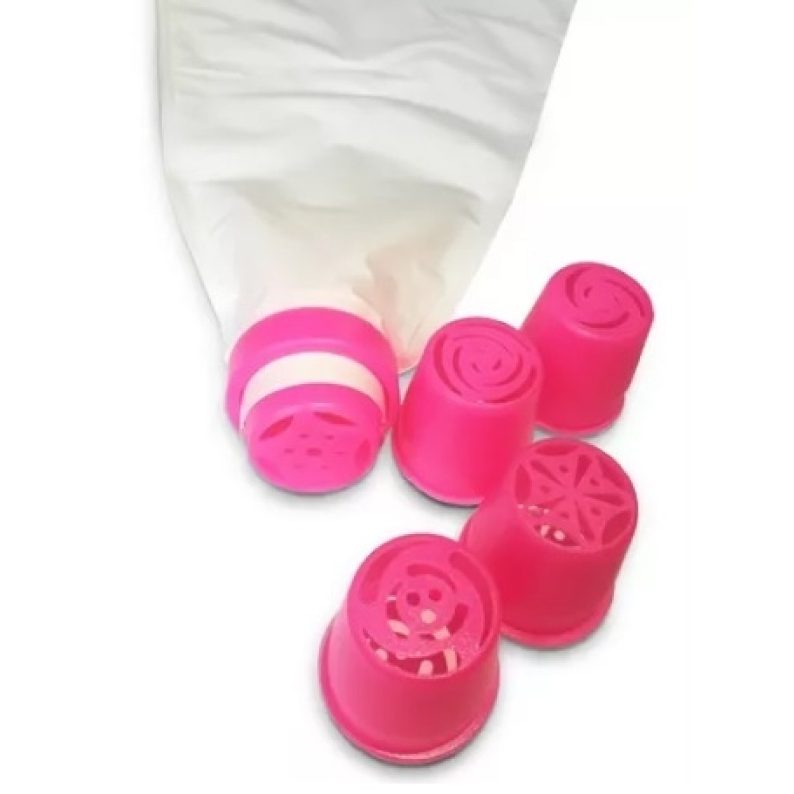 Embalagem com 1 saco (manga) de pvc, 1 anel de encaixe e 5 modelos diferente de bicos: