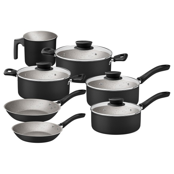 Frigideiras, caçarolas e panelas com corpo de alumínio com espessura de 1,2 mm que proporciona cozimento rápido e uniforme. Fervedor com corpo de alumínio com espessura de 1,4 mm. Revestimento interno e externo de antiaderente Starflon Max que não gruda, é fácil de limpar, mais durável e não é prejudicial à saúde, pois é livre de PFOA. Tampas de vidro temperado com bordas de aço inox. Cabos, alças de baquelite antitérmico e pegadores de nylon que oferecem segurança durante o manuseio. Podem ir à máquina de lavar louças facilitando seu dia a dia. Pode ser utilizada nos fogões: gás, elétrico e vitrocerâmico - resistência elétrica.