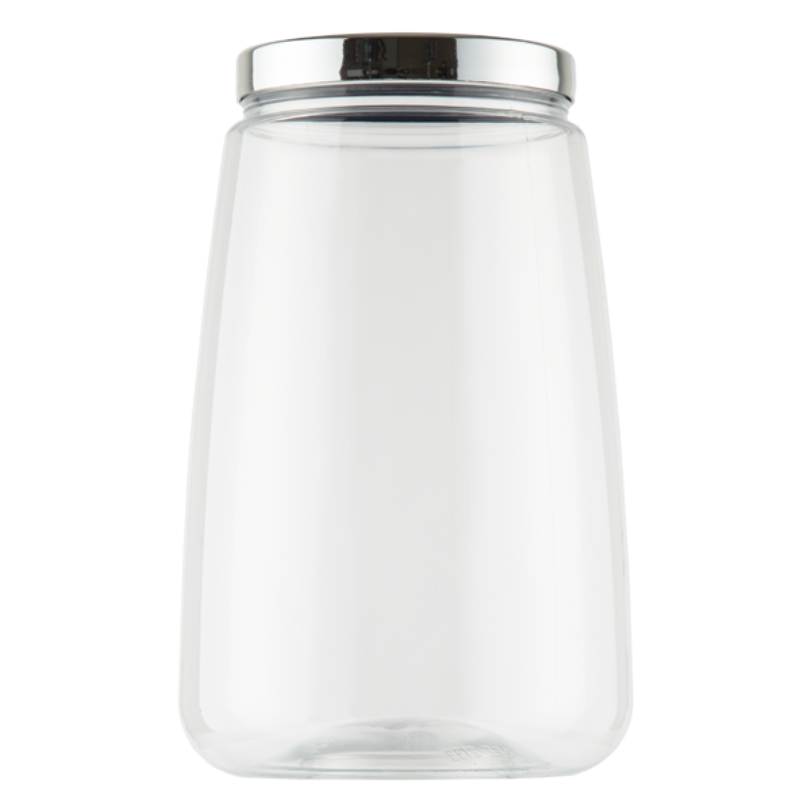 O pote pet redondo é lindo de plástico transparente com tampa metalizada,