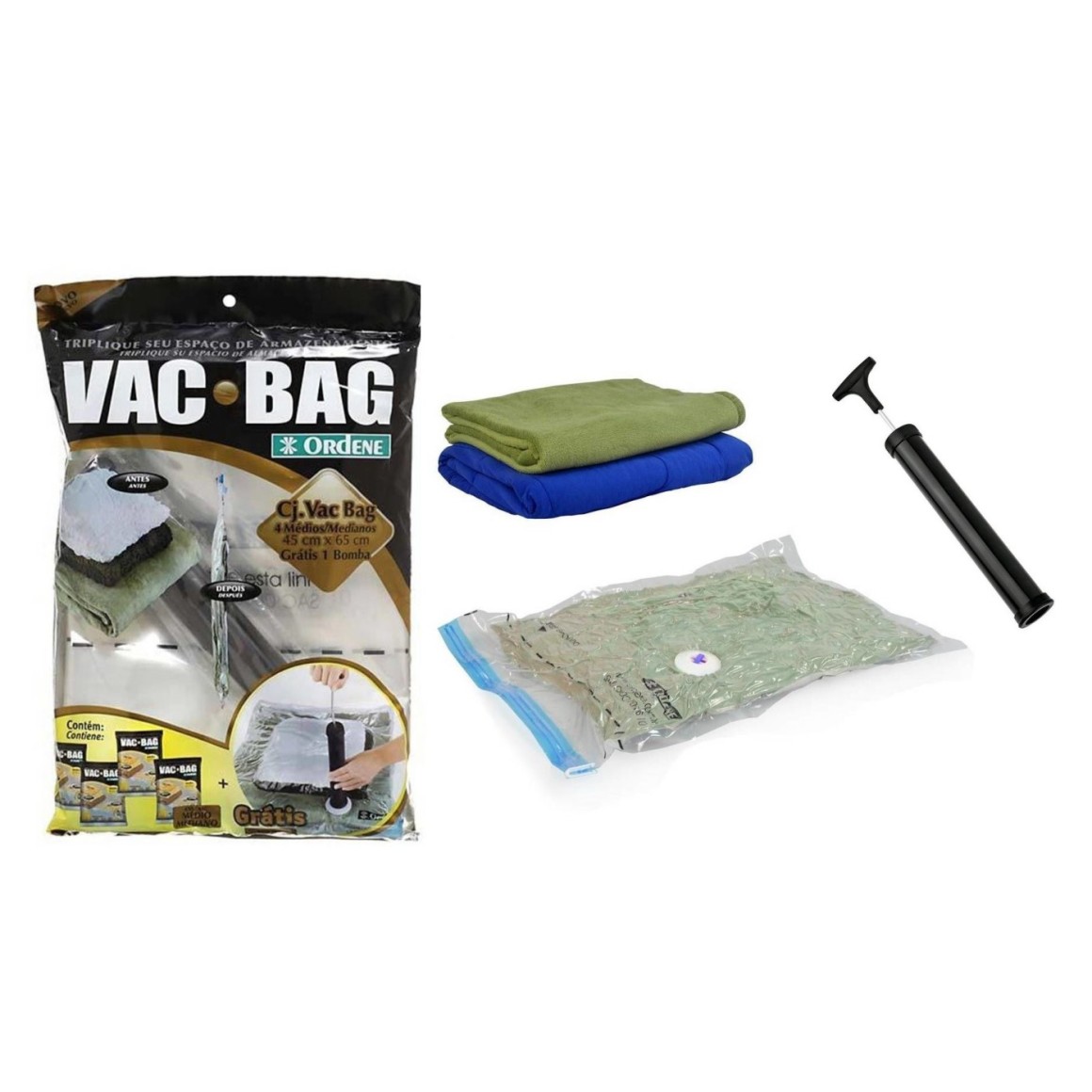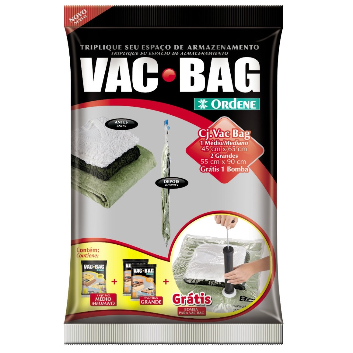 Bomba: ø4 x 28 cm / Vac Bag Médio: 45 x 65 cm / Vac Bag Grande: 55 x 90 cm
