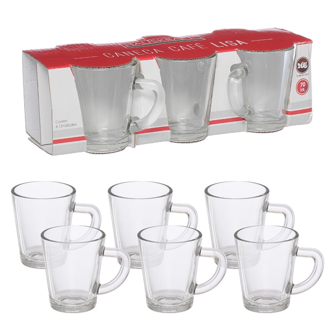 A Caneca de Vidro Café Lisa é produto que certamente tem a cara dos lanches da tarde ao lado de amigos ou familiares que já vivenciou. O jogo é composto por 6 unidades de 70ml cada, se tornando perfeito para o consumo de café, chá ou cappuccino. Leve o sentimento de nostalgia para a sua casa.