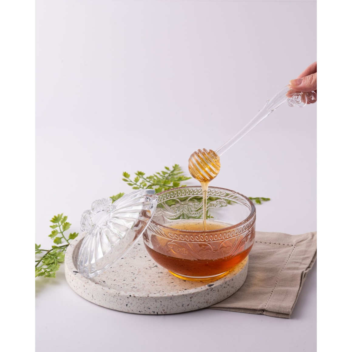 A Meleira de Cristal Ecológico com Pegador Imperial combina funcionalidade e beleza, oferecendo a você uma forma elegante de adoçar suas refeições.