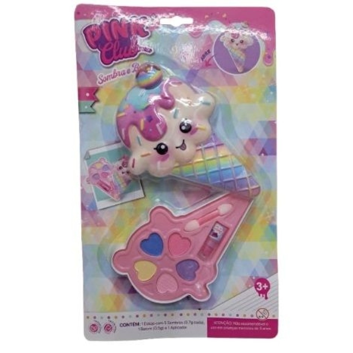 - Contém 1 estojo de maquiagem formato de sorvete de casquinha com 1 batom e 5 sombras, mais um pincel para a aplicação