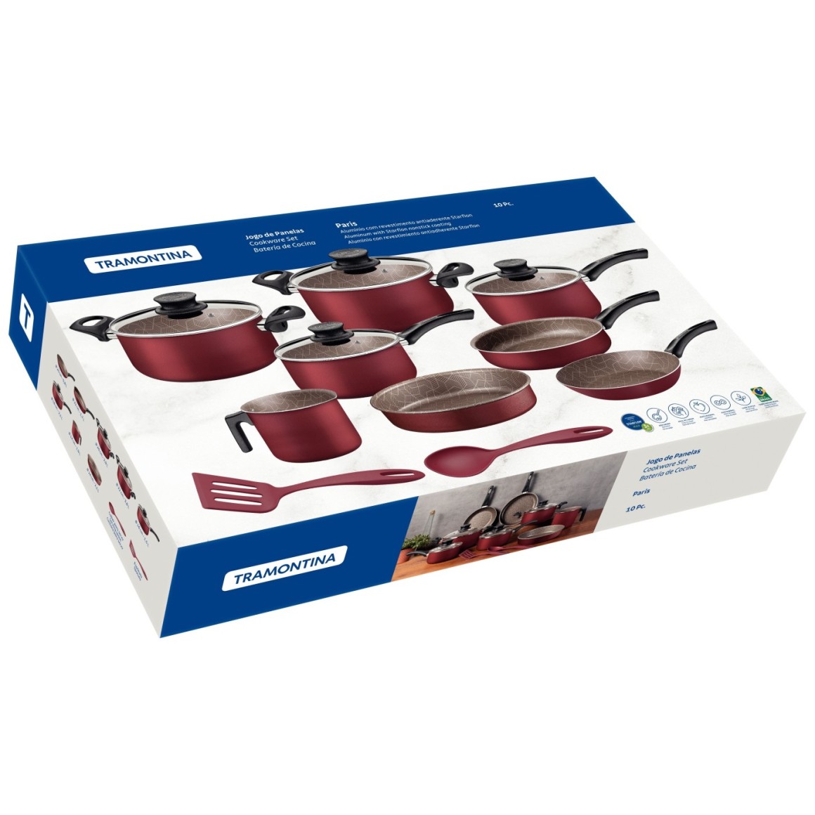 Sabe aquele item essencial para uma cozinha funcional e cheia de estilo? Com certeza, é o jogo de panelas Tramontina Paris em alumínio com revestimento interno e externo em antiaderente Starflon Max vermelho 10 peças. Adequado para uso diário, ele tem peças desenvolvidas em alumínio com revestimento em Starflon Max, características que juntas, cozinham os alimentos de maneira rápida e uniforme, sem grudar na superfície. Suas panelas e caçarolas vem com tampas de vidro temperado, com saída de vapor e bordas de aço inox e todas as peças de fogão tem cabos, alças ou pegadores em materiais antitérmicos, que não aquecem e oferecem maior segurança durante o manuseio. Além de todos esses atributos, o jogo pode ser levado à máquina de lavar louças e acompanha dois utensílios de nylon.