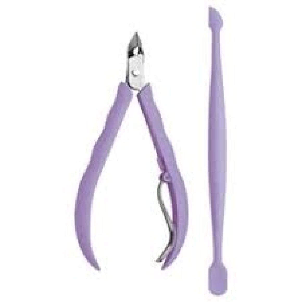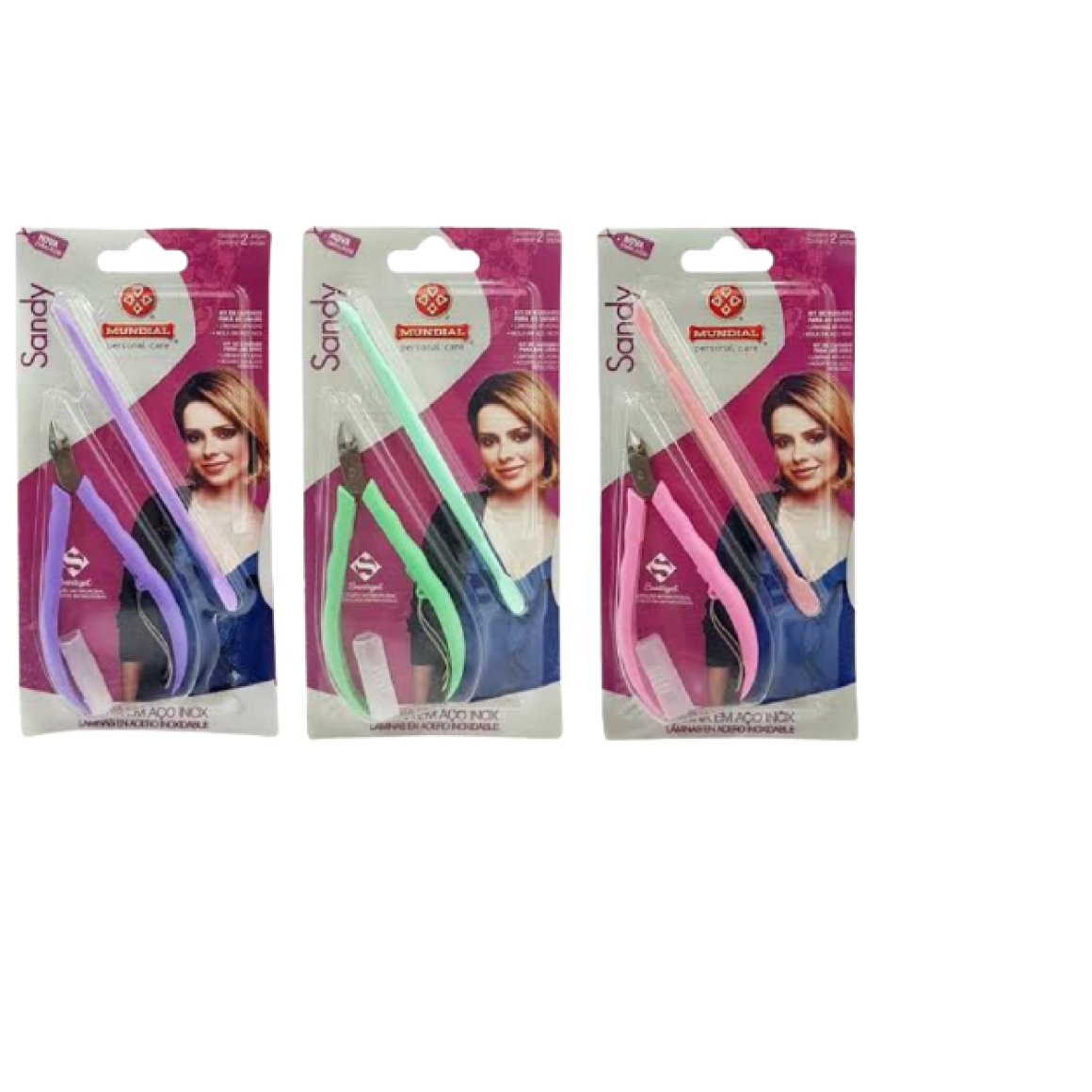 AÇÃO/Ativos: Alicate com mola resistente em aço inox; Cabos coloridos em nylon com reforço de fibra de vidro, tornando-os mais resistentes; Cabo ondulado para melhor ajuste aos dedos; Espátula dupla para empurrar e raspar a cutícula; Embalagem: Blister.