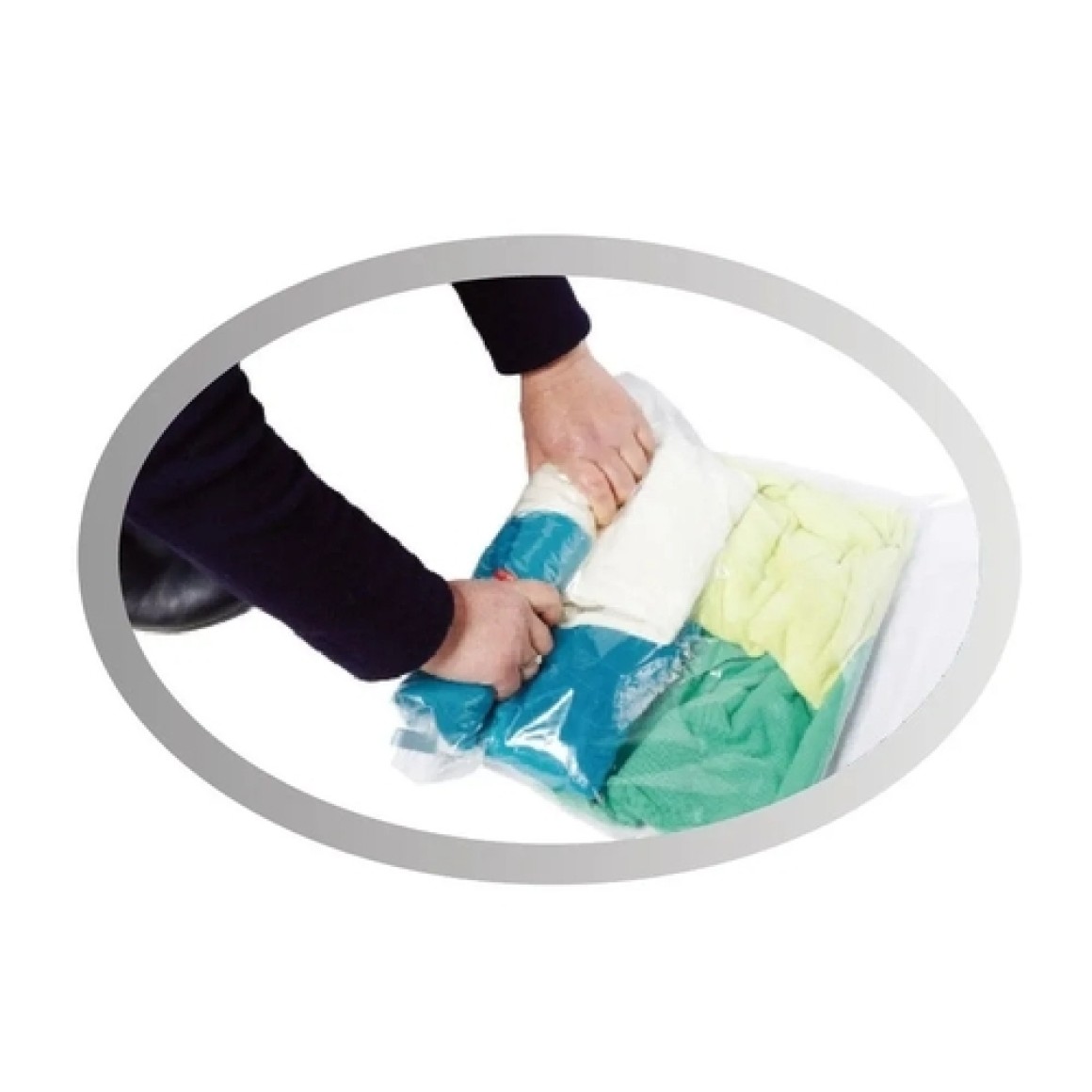 Você precisa apenas dobrar suas roupas, colocar dentro do saco plástico e apertá-lo bem e enrolar para retirar o ar interior.