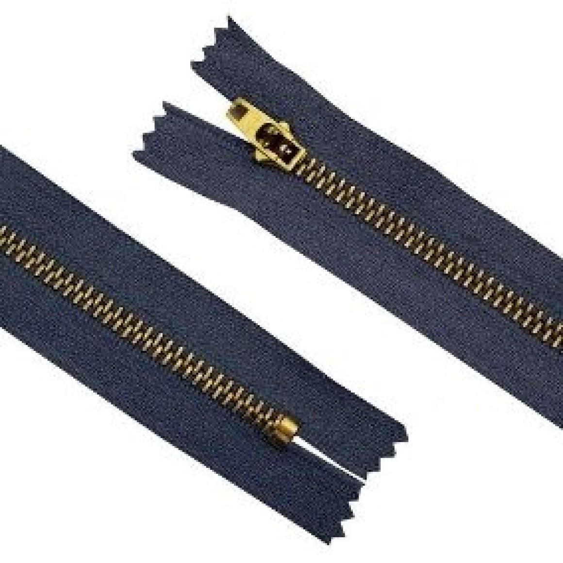O zíper de metal grosso fixo tem acabamento dourado, com cursor de trava pino.