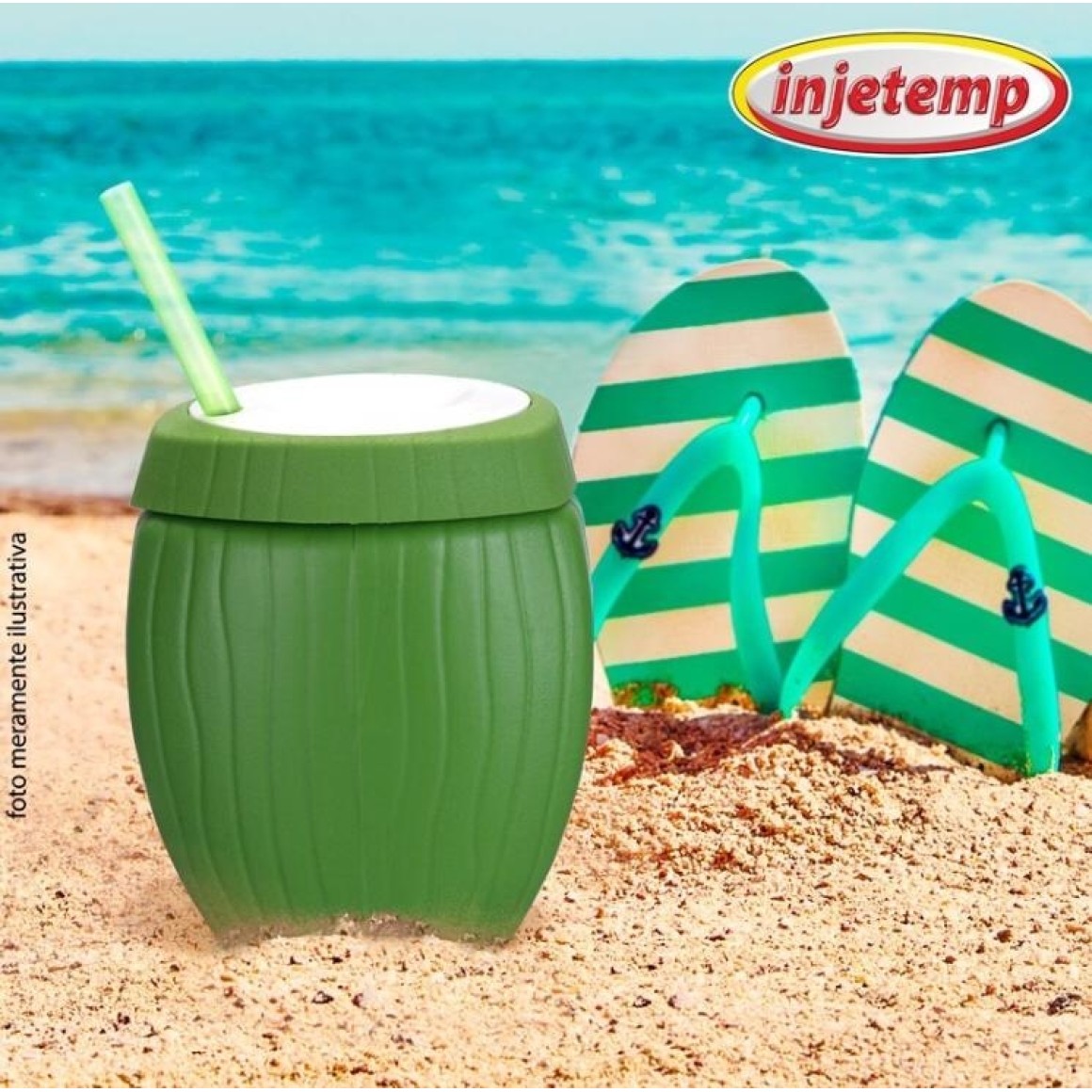 Com formato de coco verde em cores vivas, dispondo de canudo e 850 ml de capacidade,