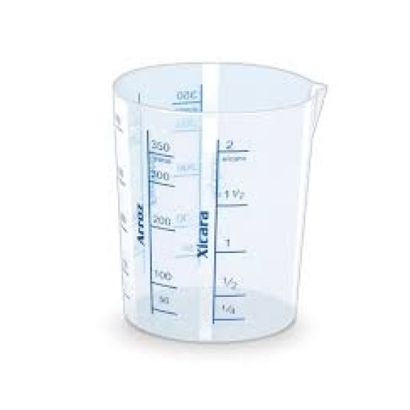 Copo graduado com diversas medidas como colher de arroz, xícaras, farinha, açúcar e muito mais,