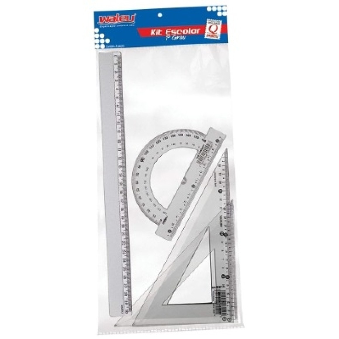 • O Kit Escolar 1°Grau é composto por, Régua 30cm, Transferidor 180º, Esquadro 60º, Esquadro 45° A Waleu possui diversas opções de kits, presente nas listas de material escolar, com ótimo custo beneficio.