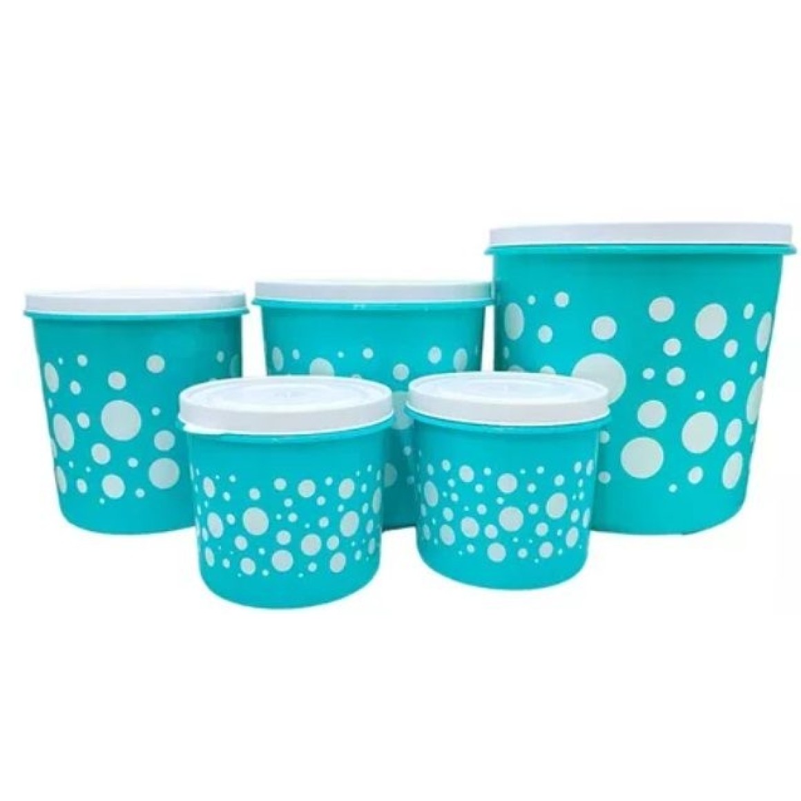 Este conjunto inclui cinco potes de plástico redondos de diferentes tamanhos para atender às suas necessidades de armazenamento na cozinha.